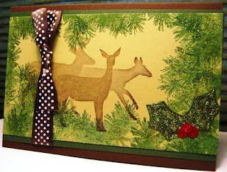 Info: Här har Elin gjort en ram genom att stämpla Pine Silhouettes upprepade gånger med en grön dyna. Motivet i mitten heter Gathering och är stämplat med en brun dyna. Järneken är stansad med QK, dien heter Holly.